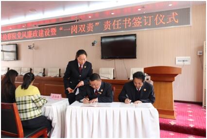 会上,王西检察长与领导班子成员、分管领导与科室负责人、科室负责人与干警分别签订了“一岗双责”责任书。